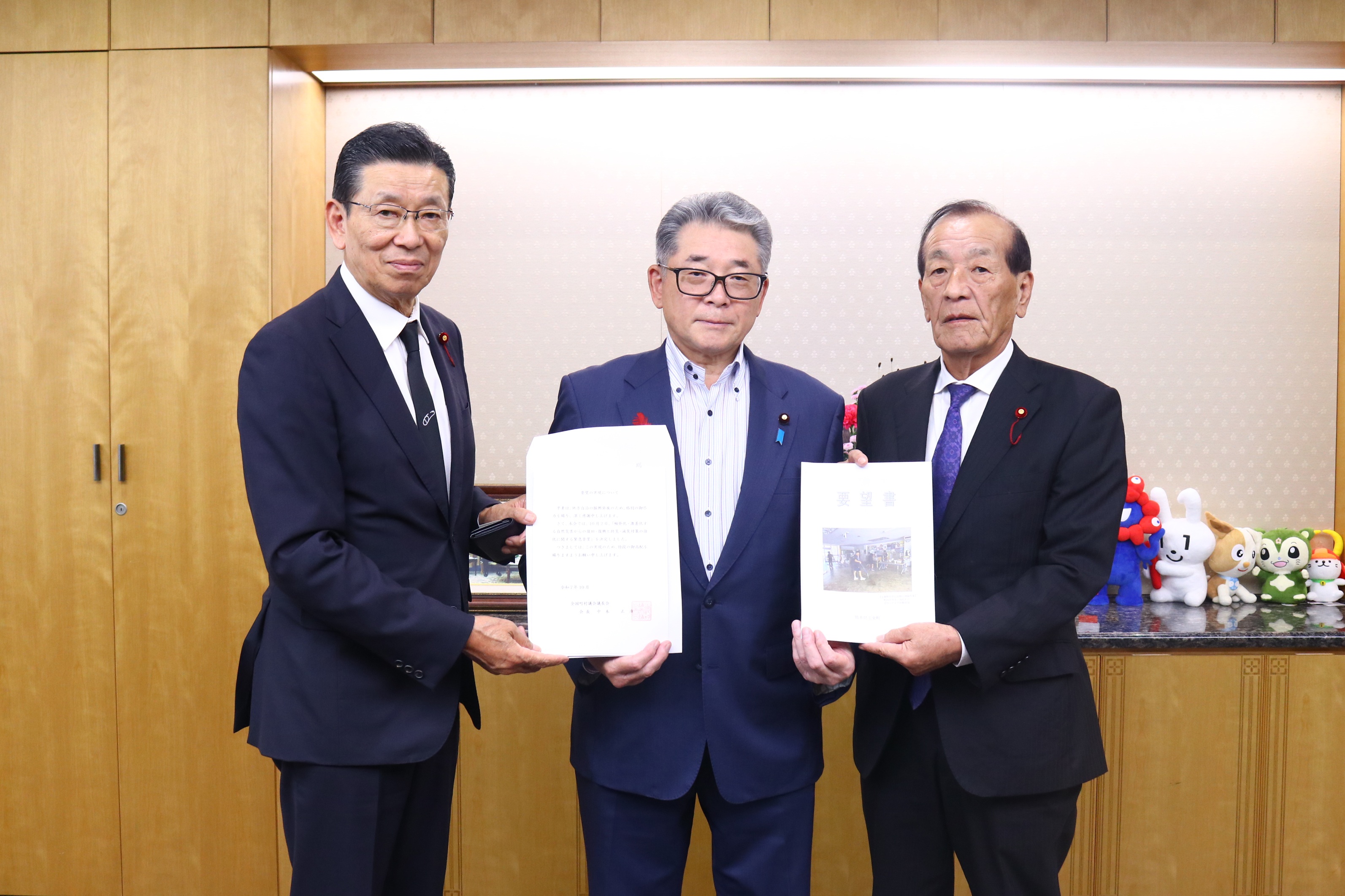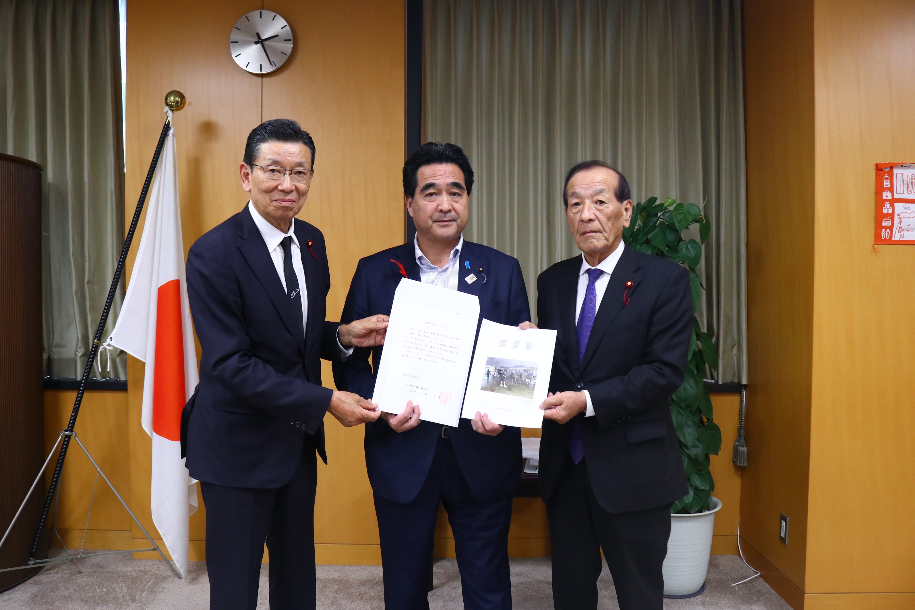 坂井学内閣府特命担当大臣(防災)(中央)に要望する中本正廣全国町村議会議長会会長(広島県安芸太田町議長)(左)と松尾純久会長(玉東町議長)
