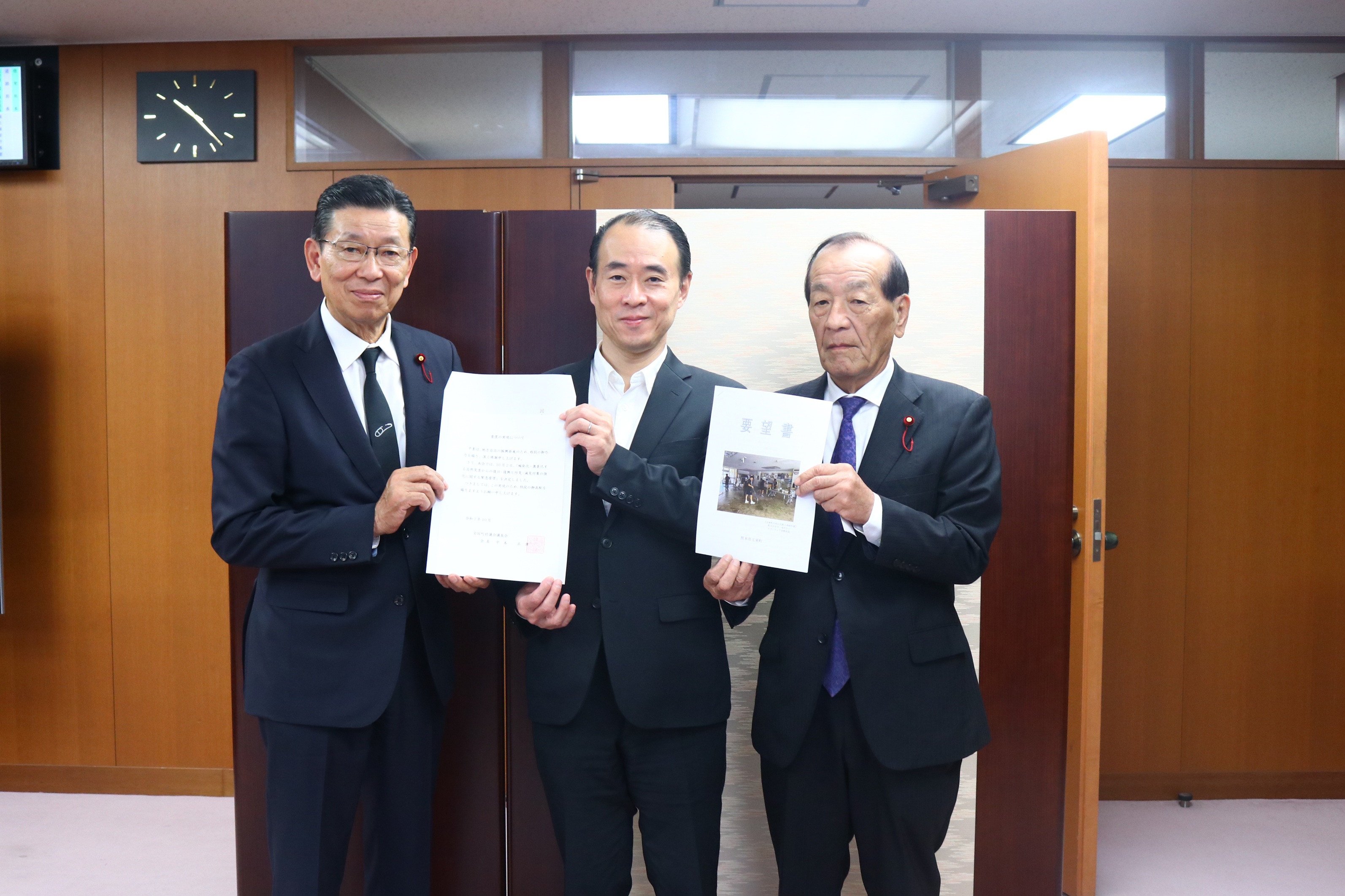 本会の松尾純久会長(玉東町議会議長)は10月2日、全国町村議会議長会の中本正廣会長(広島県安芸太田町議会議長)とともに、政府に対し、令和7年8月に県内に甚大な被害をもたらした大雨被害をはじめとした「頻発化・激甚化する自然災害からの復旧・復興と防災・減災対策の強化に関する緊急要望」を行いました。