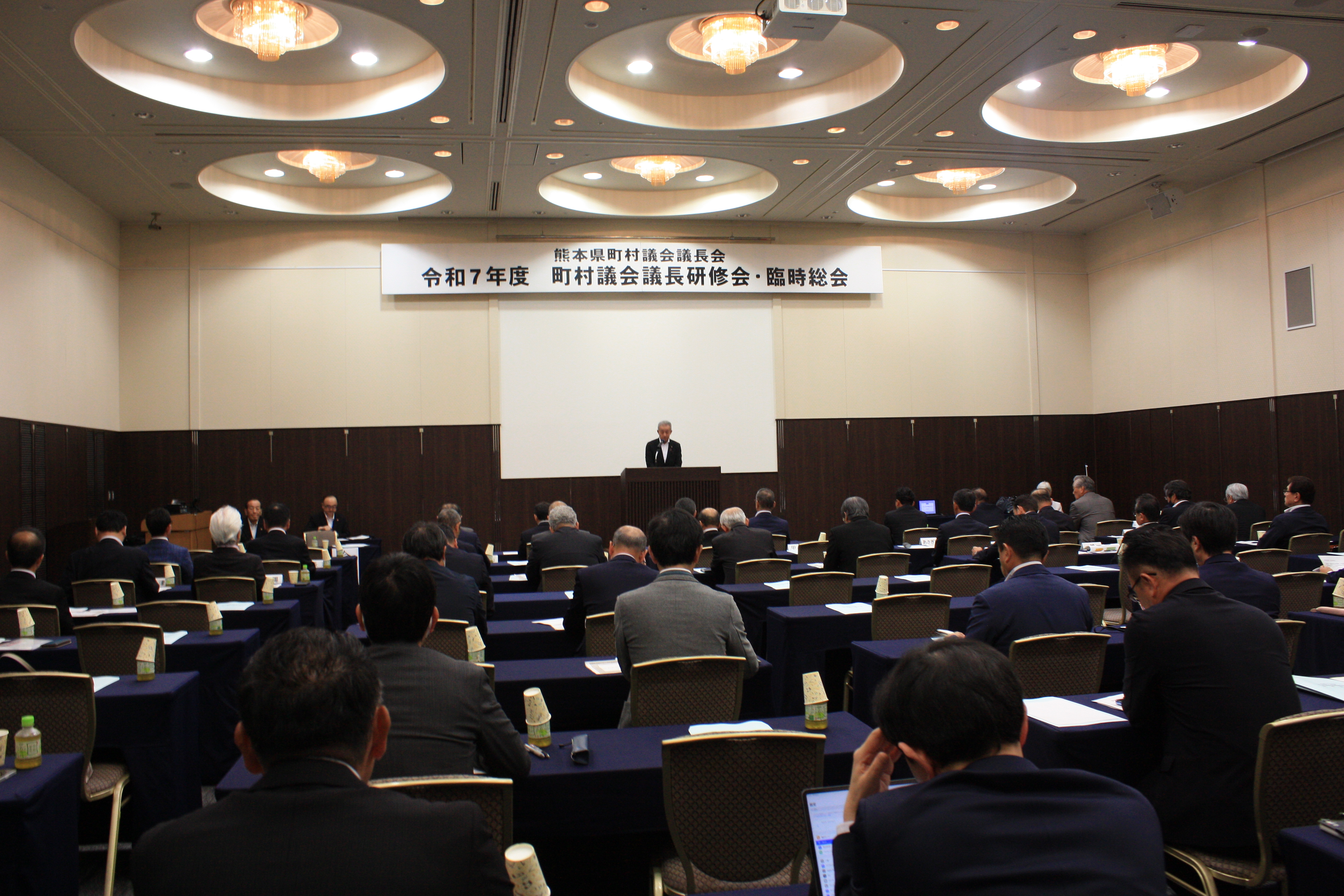 令和7年度町村議会議長研修会と臨時総会を6月3日、熊本市のホテル熊本テルサで開催し、県内の町村議会議長、事務局長等約60人にご出席いただきました。