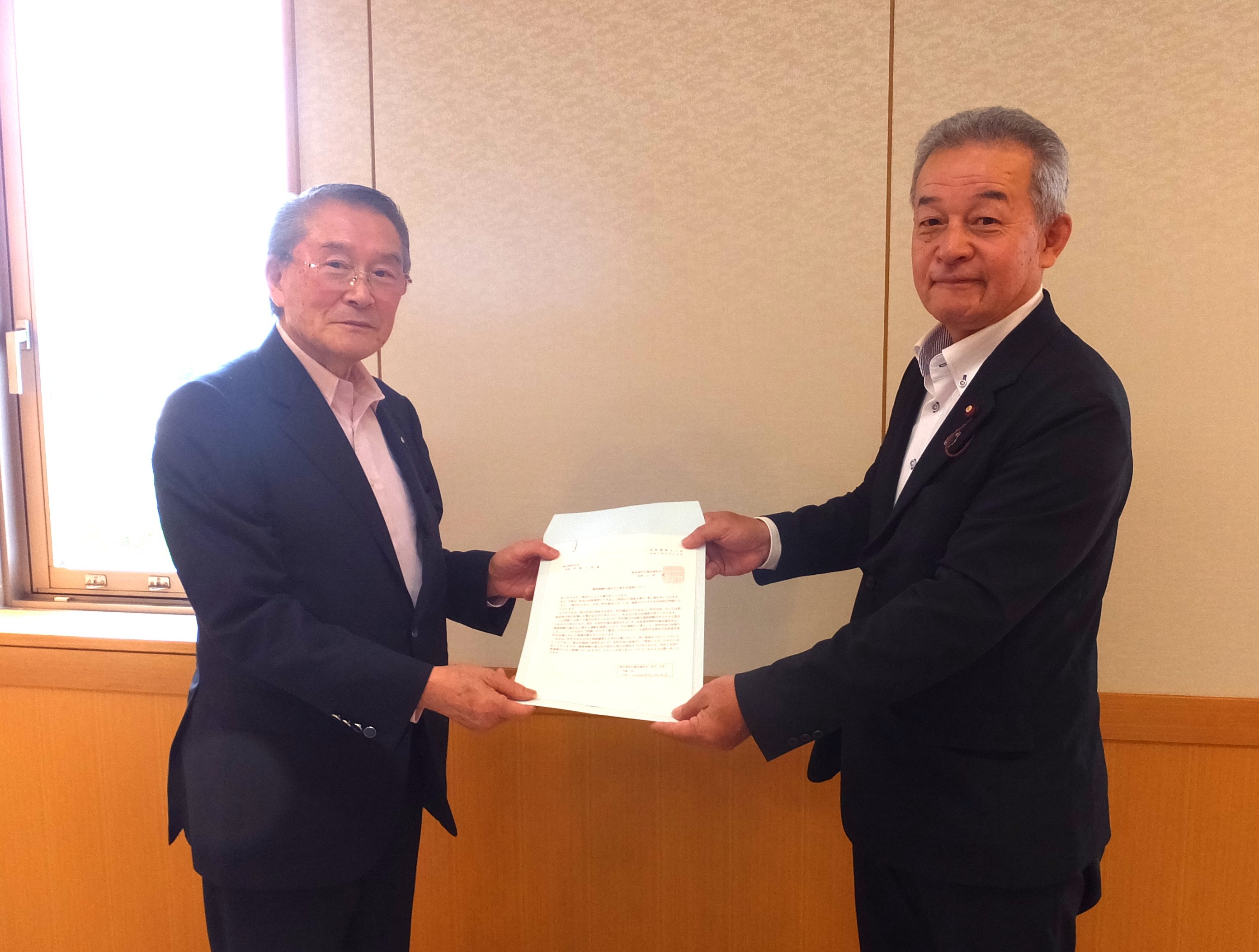 竹﨑一成熊本県町村会会長(芦北町長)(左)に対し要請書を渡す上田孝会長(美里町議長)