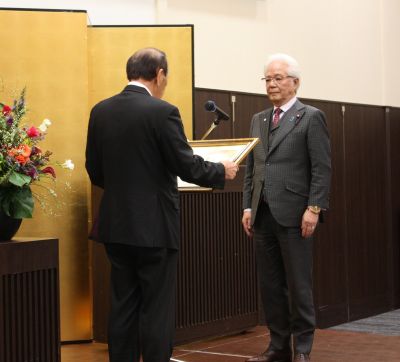 代表して本会表彰を受ける那須良策水上村議長(右)