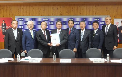 前川收会長(中央)をはじめ自民党県連役員に要望する本会理事=熊本市の自民党県連