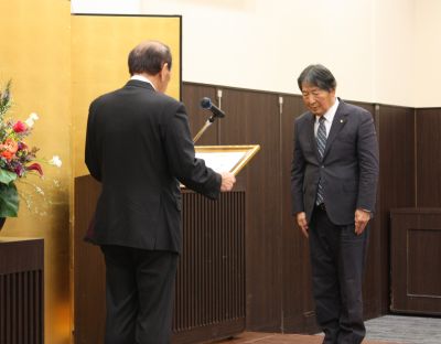 代表して本会表彰を受ける那須良策水上村議長(右)