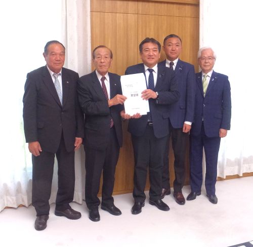 内野幸喜県議会議長(中央左)、橋口海平同副議長(同右)に要望する本会理事=熊本県庁